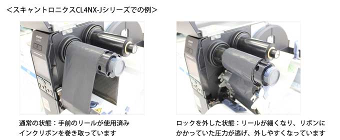 そこで開発されたサトーテクノロジーの「プリンタのインクリボン巻取りリール」では、ロックを解除し、外部部品を手前にスライドさせるという簡単な操作により巻き取りリールが細くなり、巻き取った使用済みインクリボンを容易に外せるようになりました。