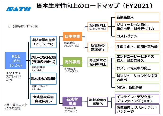 受賞の対象となったのは、サトーが2017年5月11日に公開した、2017年3月期の決算説明会資料のうちの一枚です。投資家にとって重要な指標であるROE(Return On Equity=株主資本利益率)を、5年間かけて向上させていくロードマップを解説したもので、営業利益率を軸に、サトーグループの各事業レベルまで落とし込んだものです。