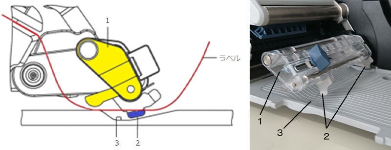 「産業用ラベルプリンタのラベルガイド装置」は、CL6NXシリーズ、CL4/6NX Plusシリーズにも用いられています。