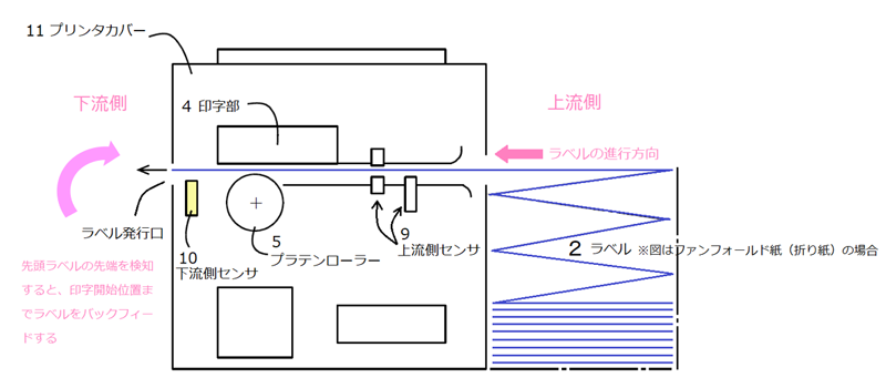 ラベル(2)をプリンタに装填した後、プリンタカバー(11)を閉じると、ラベルは印字部(4)とプラテンローラー(5)の間に挟まれるようにセットされます。その後、従来からある上流側センサ(9)がラベルを検知すると、プラテンローラーが回転し、ラベルを進行方向に搬送します。そして、先頭のラベルの先端が、今回の発明で新たに設けた下流側センサ(10)で検知されると、プラテンローラーが逆回転して、先頭のラベルを印字部まで戻します。この逆搬送によって、ラベルの1枚目から、無駄なく印字することが可能になりました。