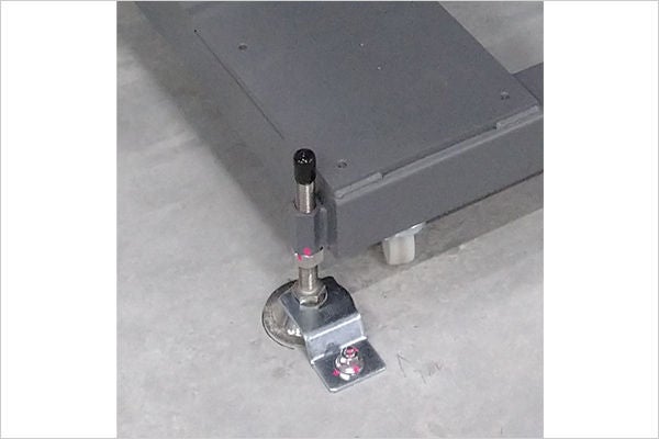 ラベルを貼り付ける対象となる物をベルトコンベヤーで搬送しながら印字したラベルを自動的に貼り付ける自動貼付機器の転倒や位置ずれを防止するため、床面にボルト(ボルトの長さは3cmから5cm程度)で定着させる工事です。お客さまの工場などの納入先にて二人一組で行われ、所要時間は10分~2時間30分/台程であり、危険性は類型的に低く(例えば、高所での作業などもありません)、また高い専門的技術を要する工事ではありません。