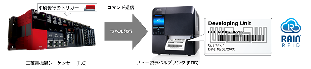 株式会社サトー(以下、サトー)と三菱電機株式会社(以下、三菱電機)はこのたび、三菱電機のMELSECシーケンサー向け、ラベル自動発行用サンプルプログラムにラインナップを追加し、グローバルに提供を開始いたします。このサンプルプログラムにより、生産ラインでの特定イベントの発生を起点として、サトー製ラベルプリンタに印字コマンドを送信することが可能となり、ラベル発行の自動化を推進します。