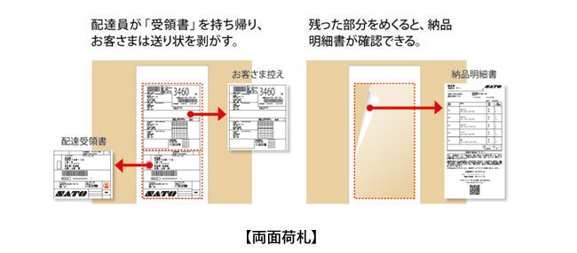 両面荷札はEC業界の運用に基づき設計しました。送り状(表面)と納品書(裏面)の2枚が合わさり一体となったもので、送り状の外枠に入った切れ込みを剥がすと数十ミリの糊面が現れ荷物に貼り付く仕様です。荷物が配達されたら、送り状に入ったミシン目に沿って上半分を切り取り「お客さま控え」に、下半分は「配達受領証」になります。さらに中から納品書(裏面)が確認できます。