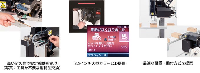 3.5インチの大型カラー液晶ディスプレイを搭載し、ラベル、インクリボンセットから消耗部品の交換まで、動画を見ながら簡単に操作が行えます。さらに表示31言語、印字47言語へ対応し、お客さまの環境に合わせた「貼付方式」「設置方向」「流れ方向」「ヘッド密度」の54通りの豊富な組み合わせをご提供するなど、お客さまの業務効率を向上させる各機能を搭載しています。