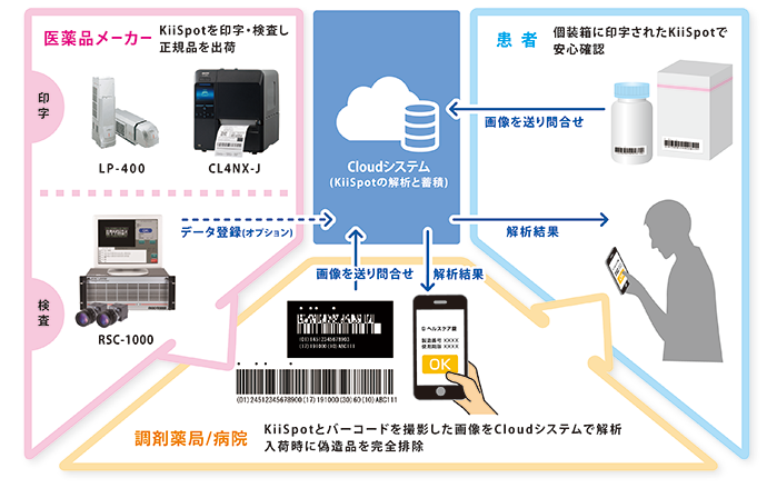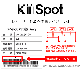 「KiiSpot」は暗号アルゴリズムによって、バーコード類の付近に特定のマーク(偽造防止マーク)を複数印字し、それをスマートフォンの専用アプリで撮影、クラウドシステムにつないで個体識別を行うことで、誰でも簡単に真贋判定を行える世界初の技術です。同じバーコードを印字された商品やケースであっても、その偽造防止マークによって真贋性を判定します。医薬品の製造時に、偽造防止マークを個装箱や外箱に印字・検査し出荷することで、流通(卸売)の現場で、また調剤薬局・病院での受け入れ検査で、さらに患者さんご自身でも、箱に印字された偽造防止マークをスマートフォンで読み取り、真贋判定を容易に行うことができます。