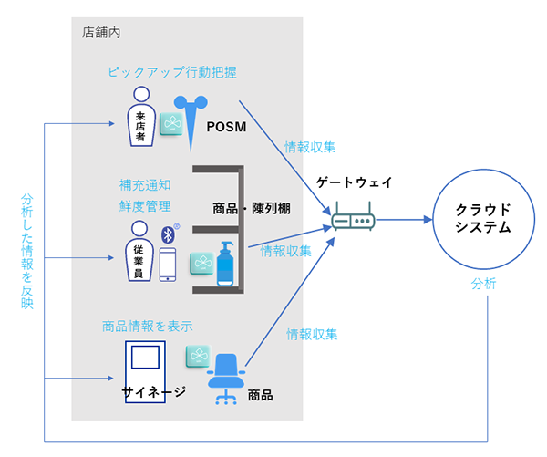 今回展示するリテールアプリケーション・サービスでは、Wiliotタグを店舗内の商品一つ一つや商品の陳列棚、販促見本に貼り付けることによって、店舗内のモノや来店者の動きを把握します。Wiliotタグは、センサ機能を持つ電池レスの超小型Bluetooth®タグで、取り付けられたモノの位置、温度、動き、容量の変化などをスマートフォンや店舗内の什器などを通じて捕捉します※1。また、周囲の電波を電力に変換することによって動作し続けられるので、Wiliotタグが取り付けられたモノから継続的に情報を集められます。