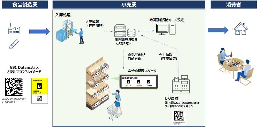 賞味・消費期限情報を持つ二次元バーコードラベルを商品に貼り付けることで、これまでのSKU単位ではなく、SKU×賞味・消費期限単位での在庫管理を可能とする仕組み。電子棚札を利用し期限別在庫情報に応じた価格表示の実現により、価格更新のための棚札の差替え作業や値引きのための値引きラベルの貼付作業が不要となる他、従来の20%や40%といった値引きを期限直前に一律で行うのではなく、より細かい割引率で何度でも価格変更をすることが可能となる。データの蓄積が進んだ段階で、AIを活用した自動の価格設定機能の追加も想定している。