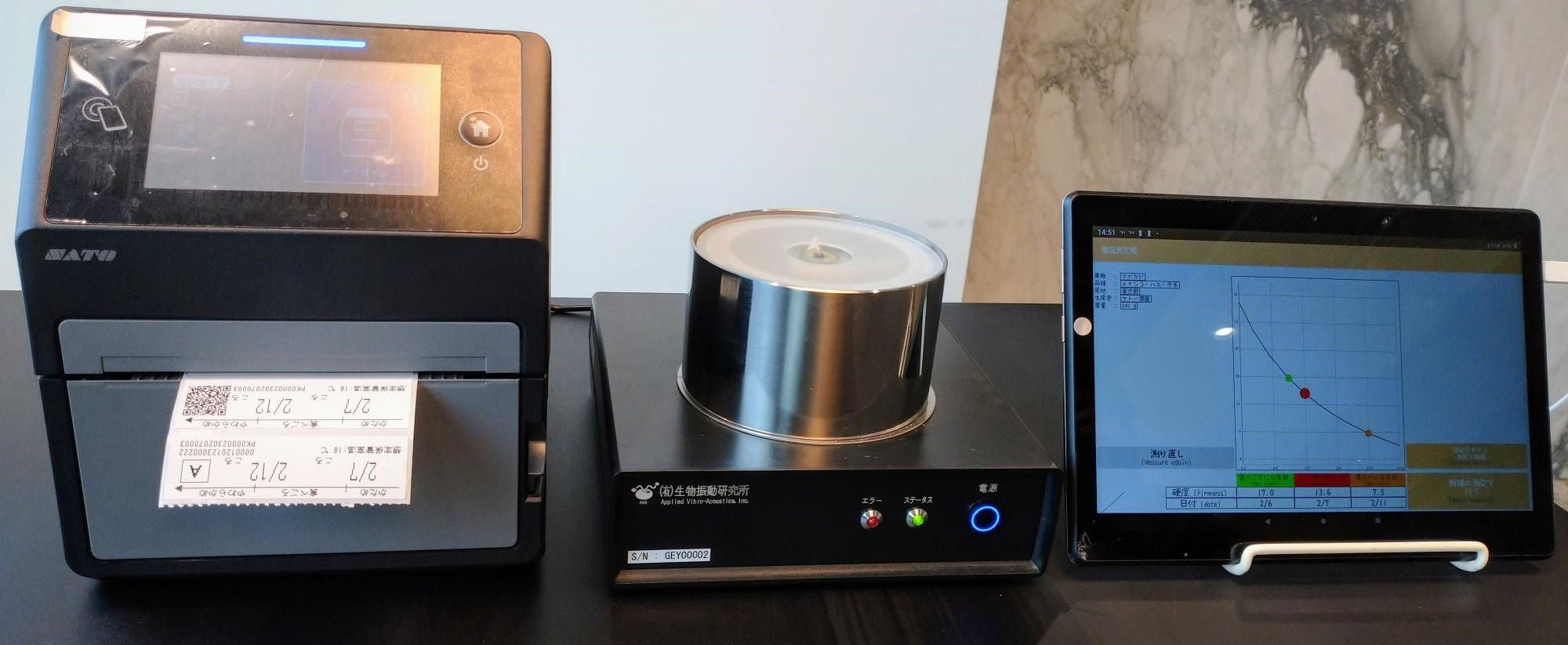 ※「非破壊硬度測定機」(中)で果物の硬さを測り、測定結果をもとに果物の食べ頃を予測する「coro-eye」の画面(右)と、測定した食べ頃予測をラベルで出力するサトー製プリンタ(左)。