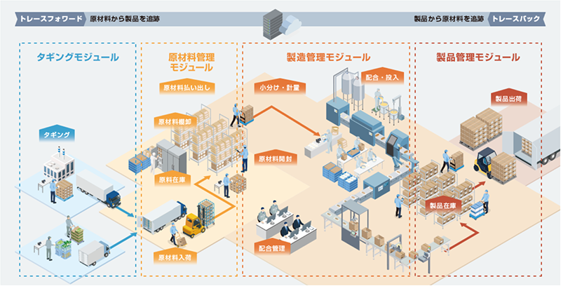 原料入荷、食品製造工程、製品出荷まで工場内のモノの動きをトータル管理するシステムです。自社工場のみならず、取引先、海外工場、外部倉庫、さまざまな拠点の情報をシームレスにつなぎ、食の安心・安全を支援します。