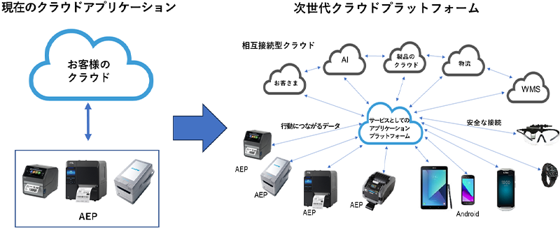 当社が2010年から提供中であるオンプレミスのAEP(Application Enabled Printing)は、お客さまごとの運用環境に合わせてラベル発行をカスタマイズするソフトウェアです。これにより、プリンターは印字データを外部から受信し印字実行するだけでなく、PC不要の独立端末としても機能します。AEPにより周辺機器(例:バーコードリーダー、計量器、温度計、PLC)と直接接続し、プリンター内部で情報をラベル印字用に処理できます。当社は、このAEPをノーコードで業務アプリ作成ができるクラウドプラットフォームとして新たに開発することで拡張性を高め、また、データ連携機能を提供することで、お客さまの運用ニーズに迅速かつ効率的な対応の実現をめざします。