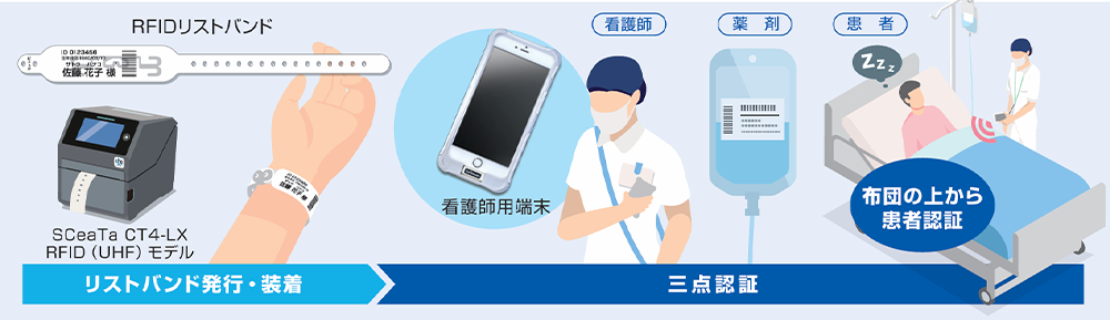 こうした課題に対し、サトーヘルスケアが提供するUHF帯RFIDリストバンドと、ラベルプリンター「SCeaTa CT4-LX」を活用し、布団の上からでも患者の認証が可能となりました。現在は、大阪医科薬科大学病院の全病棟に導入され、看護業務の省力化と患者ケアの質向上に貢献しています。