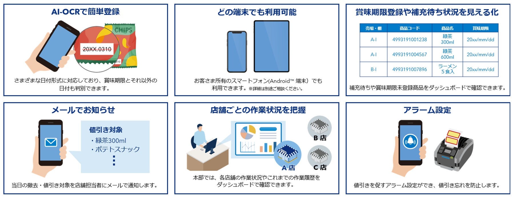 初回導入時に最も賞味期限が短い商品を登録することで、それ以降は賞味期限の確認が必要な商品をシステムがアラートで通知します。店舗運営担当者は、アラートに基づき該当商品を陳列棚から確認・撤去する運用に変更でき、全ての陳列棚を定期的に確認する作業の削減が可能になります。また、クラウドサービスであるため、チェーン店全体の商品管理を可視化および一元管理が可能となり、店舗ごとの利用状況の把握にも対応します。