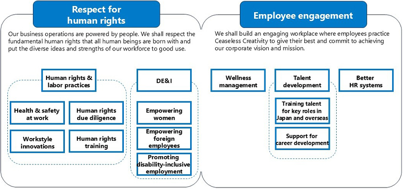 We have recently redefined our materiality assessment to include respect for human rights and employee engagement. By working on these material social topics, we hope to build a workplace where we match diverse employees to their roles and empower them to grow and thrive under strong HR governance. We understand that our Japan and overseas offices face different HR challenges, and are making efforts to improve how we manage human capital at the group level.