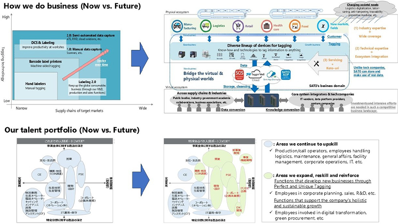 To create value for customers and help solve shared challenges in society, we plan to reach new markets/domains and expand our business through Perfect and Unique Tagging,1 which involves using RFID and various technologies and devices to tag data to everything to connect it seamlessly and bridge the physical and digital worlds. This new way of doing business and raising our corporate value requires upskilling some areas of our workforce while expanding, reskilling and reinforcing those areas that develop new businesses and support the company's holistic and sustainable growth. It also requires cultivating a culture of innovation. We start by empowering employees to practice corporate values in their daily work and hone our competitive advantage of genbaryoku2 to ensure they are self-reliant and self-determining to think and act proactively to initiate changes.