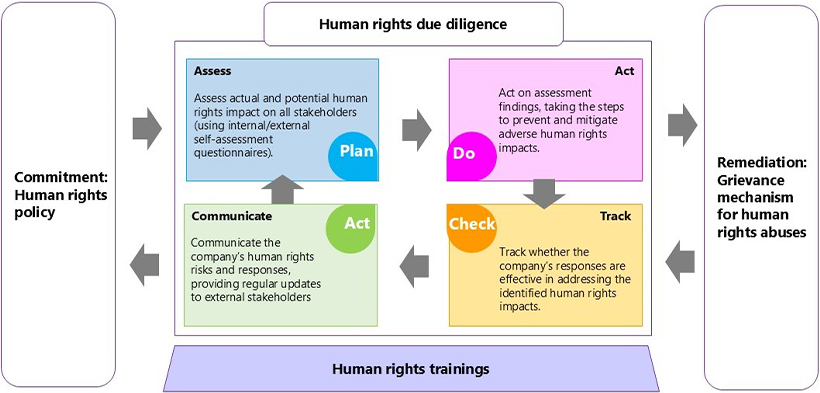 We adopt a human rights due diligence model that is based on international standards such as the UN Guiding Principles and the Japanese government's guidelines on respect for human rights in responsible supply chains. Together with business partners, we apply this model and promote human rights across our supply chain.