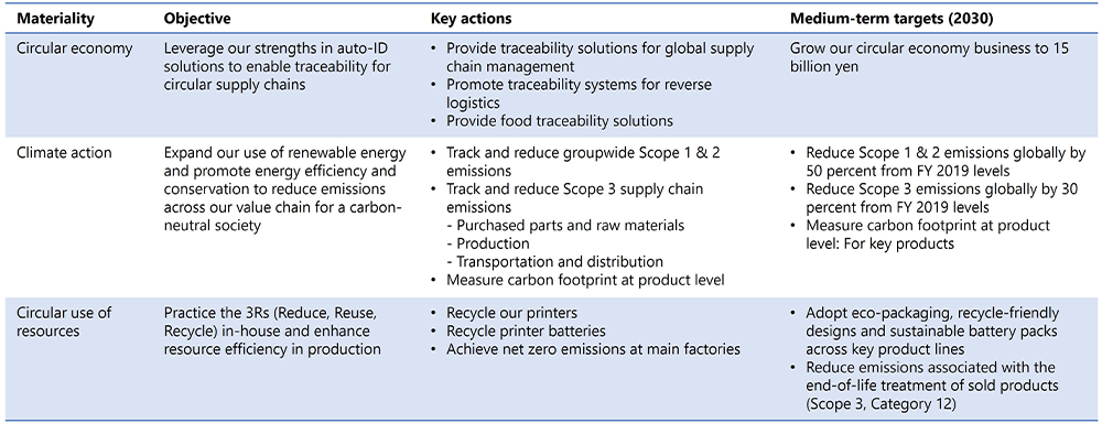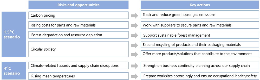Actions we can take to mitigate risks include reducing our greenhouse gas emissions and building a socially responsible procurement framework. Possible actions for capturing related opportunities, on the other hand, center on delivering value to customers and society through, for example, developing and offering more products and solutions that help reduce waste and expanding business for data collection or utilization.