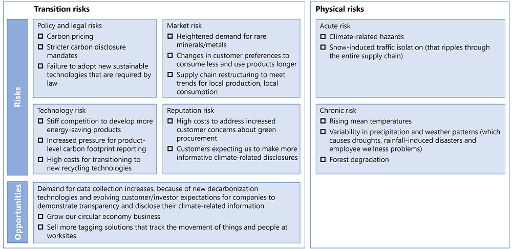 We conduct climate scenario analyses to identify climate-related risks and opportunities that may affect the AIDC (automatic identification and data capture) industry over medium- to long-term horizons (2030, 2050). We assess potential business impacts, determine strategic responses and incorporate the insights into our disclosures. Starting FY 2024, we enhanced the specificity and transparency of our disclosures by explicitly linking climate-related risks and opportunities to our materiality assessment.