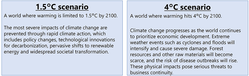 Since the gap between the 1.5°C and 4°C scenarios widens significantly after 2030, our analysis emphasizes the long-term outlook, focusing on how our industry and customers could be affected under each scenario in 2050.
